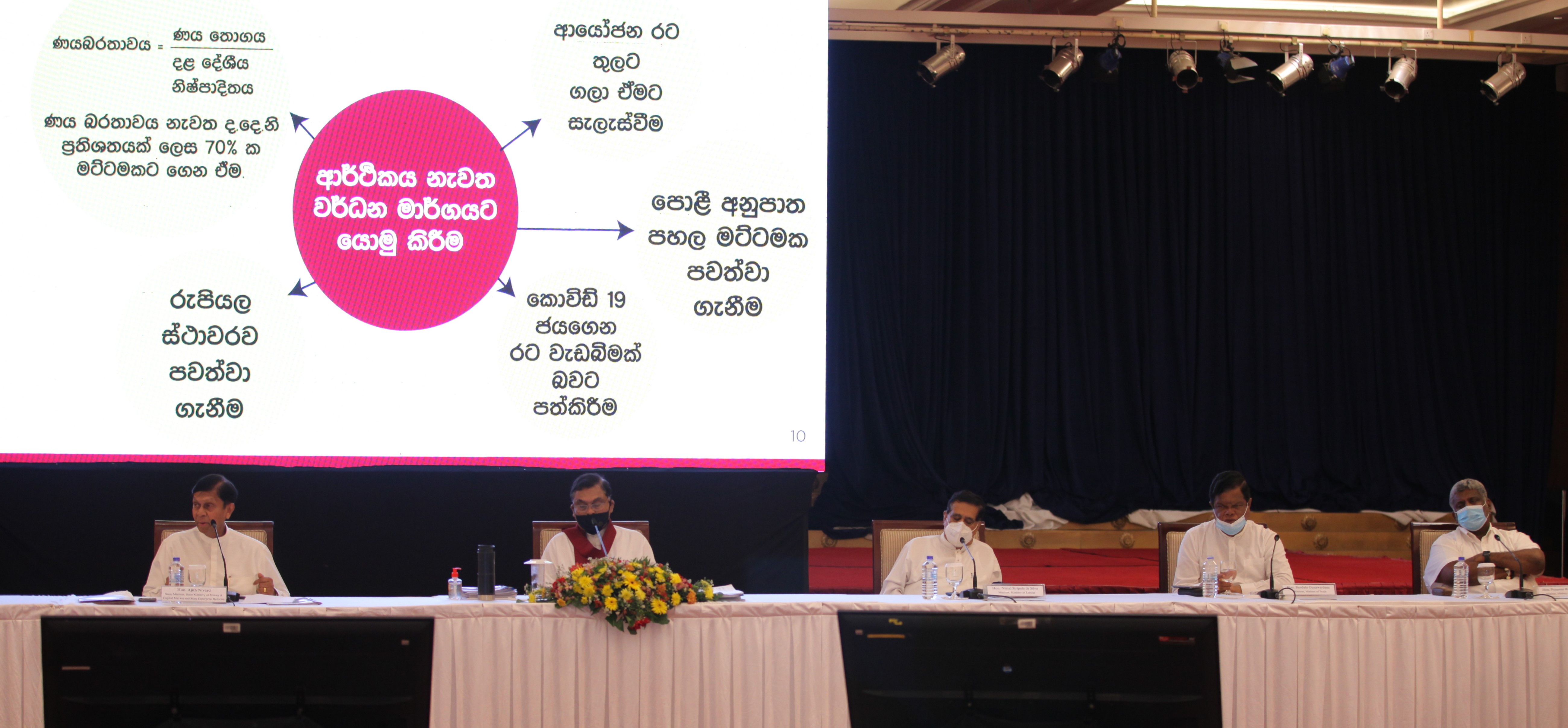 රටේ වර්තමාන ආර්ථික තත්වය සහ අනාගත ආර්ථික ඉලක්ක පිලිබඳ අමාත්යවරුන් , රාජ්ය අමාත්යවරුන්, රාජ්ය නිලධාරීන් සහ පෞද්ගලික අංශයේ ආයතන ප්රධානීන් දැනුවත් කිරීමේ විශේෂ වැඩසටහනක් පසුගියදා (18) ආර්ථික පුනර්ජීවනය හා දරිද්රතාව තුරන් කිරීම සඳහා ජනාධිපති කාර්ය සාධක බලකායේ සභාපති බැසිල් රාජපක්ෂ මැතිතුමාගේ ප්රධානත්වයෙන් අරලිය ගහ මන්දිරයේදී පැවැත්විණි. මෙහිදී මුදල් හා ප්රාග්ධන වෙළඳපල සහ රාජ්ය ව්යවසාය ප්රතිසංස්කරණ රාජ්ය අමාත්ය අජිත් නිවාර්ඩ් කබ්රාල් මැතිතුමන් විසින් පසුගිය පාලන සමයේදී සිදු වූ ආර්ථික පරිහාණිය සහ ආර්ථිකය ගොඩනැගීම සඳහා වර්තමාන රජය ගෙන යන වැඩ පිළිවෙල සම්බන්ධයෙන් කෙටි පැහැදිලි කිරීමක් සිදු කළේය. එමෙන්ම ආර්ථික ඉලක්ක පිළිබඳව මහබැංකුව විසින්ද දීර්ඝ පැහැදිලි කිරීමක් සිදු කරන ලදී.