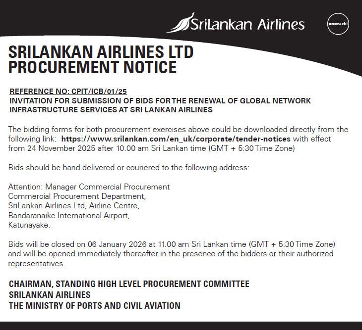 Bid closing date: 02 December 2025 at 11.00 am Sri Lankan time (GMT + 5:30 Time Zone)